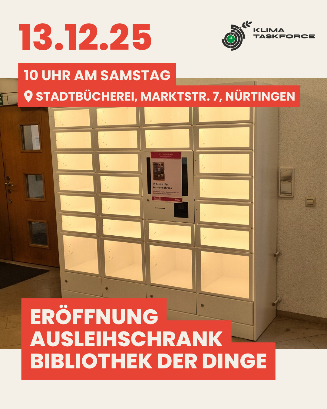 Leihen statt kaufen: Was in vielen Städten bereits gelebte Praxis ist, wird in Nürtingen jetzt noch einfacher und flexibler. Gemeinsam mit der Stadtbücherei Nürtingen laden wir zur Eröffnung unseres neuen Rund-um-die-Uhr-Ausleihschranks für die Bibliothek der Dinge ein. Am Samstag, 13. Dezember 2025, wird Oberbürgermeister Johannes Fridrich um 10 Uhr den innovativen Ausleihschrank im Vorraum der Stadtbücherei Nürtingen, Marktstraße 7, offiziell seiner Bestimmung übergeben.